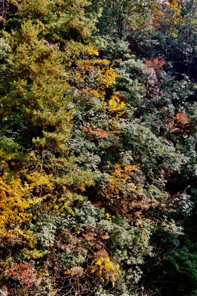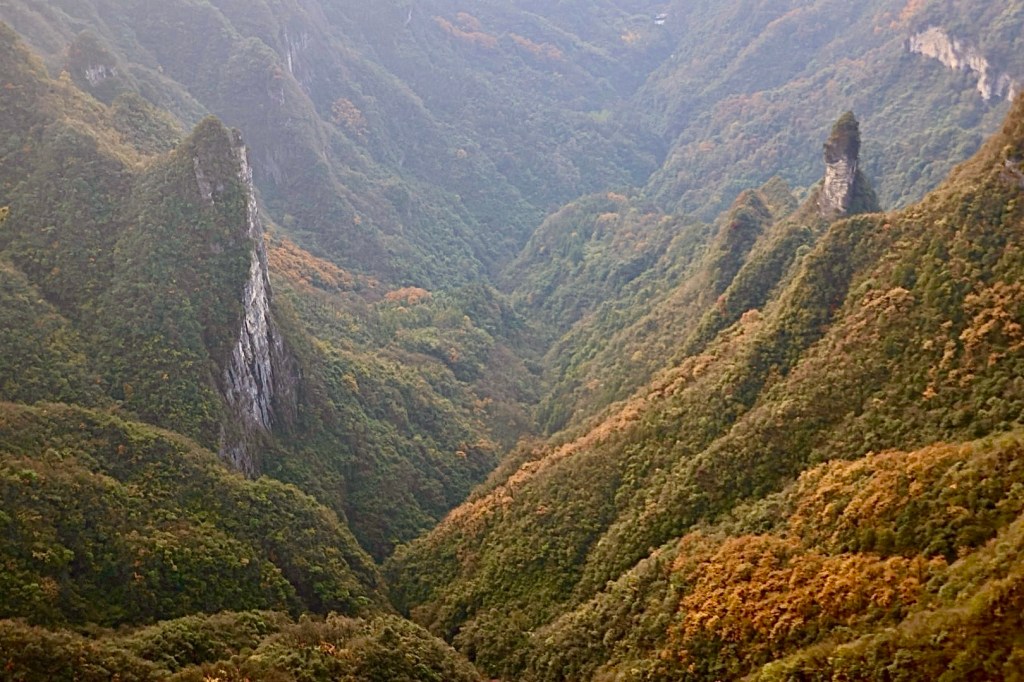 Fuimos a la entrada sur del Parque Nacional de Zhangjiajie. Era muy distinta a la zona de Wulingyuan: menos gente, arces rojos gigantes, un río a nuestros pies y los pináculos de arenisca enmarcando el paisaje. Subimos en teleférico y alquilamos los “robots”.